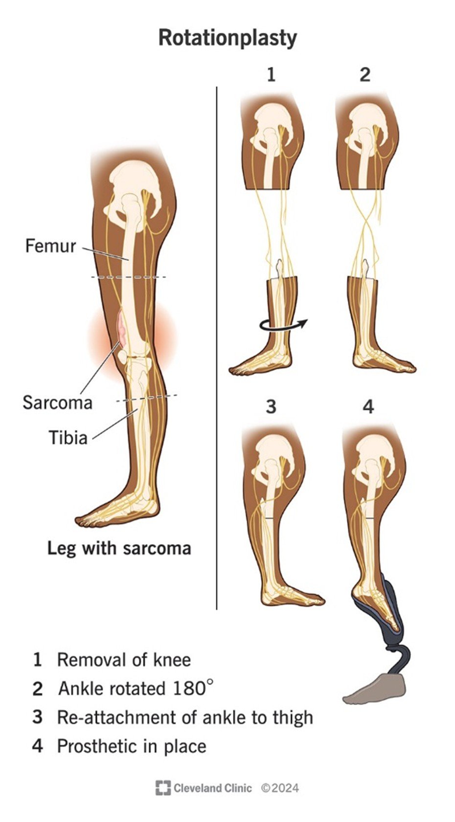 3. Lastly, what my parents chose for me (and what was recommended by the surgeon) was rotationplasty, a rare amputation that offers a lot of advantages. First, it does not lead to phantom pain. Second, it causes what was formerly your ankle joint to act as a replacement knee. While it does not have the full range of motion you would normally have, it still offers a large boost in mobility which is helpful for participating in physical activities. One thing to consider, however, is that it does look very strange (see picture below). The appearance was not really a concern for my parents, and because I have had it since I was very young, its appearance also does not bother me.